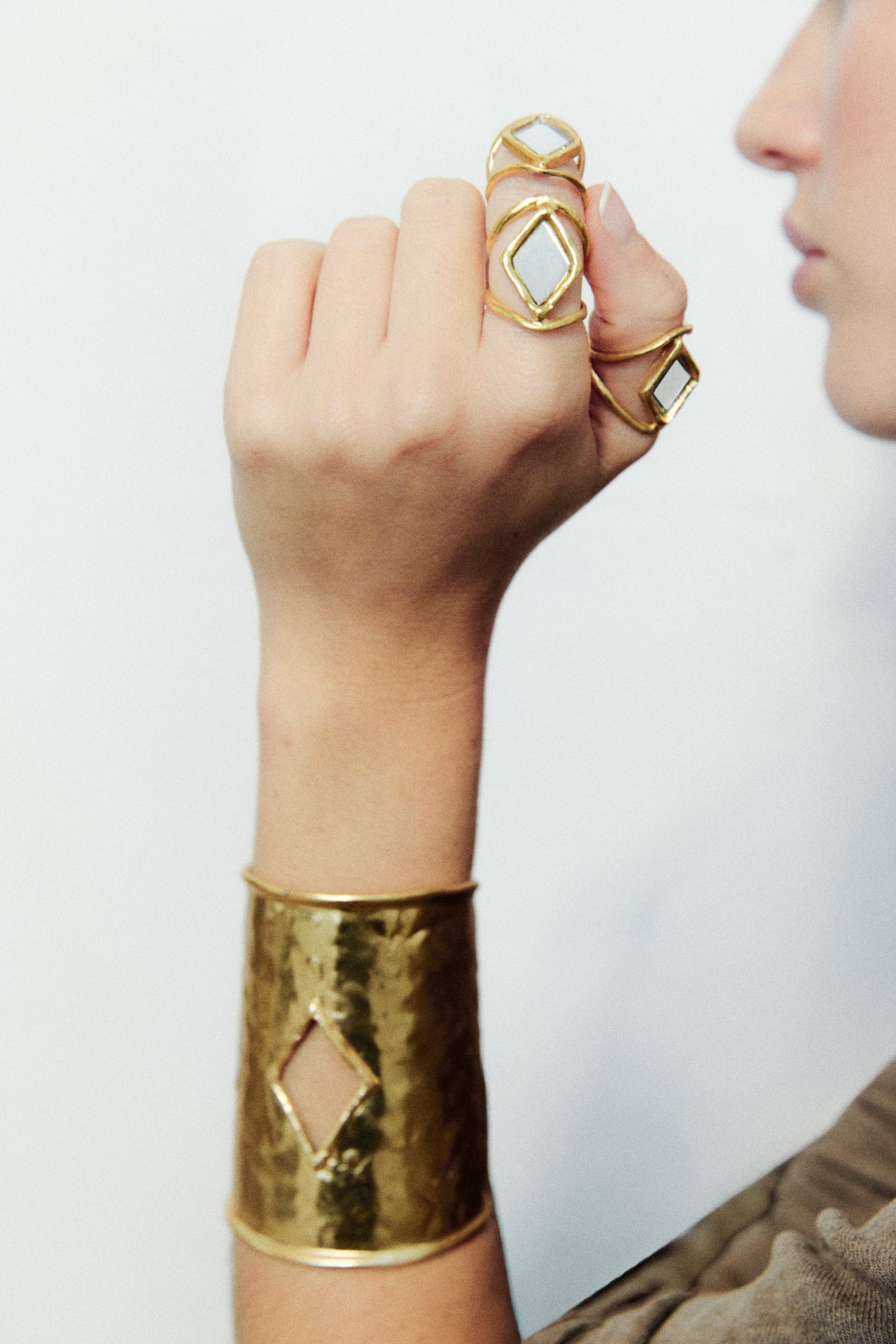 Anillo de mano con espejo en forma de rombo.