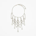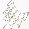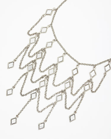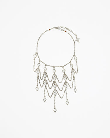 Collar elaborado en latón con baño de plata, compuesto por múltiples cadenas que caen en cascada formando una red envolvente sobre el escote. Cada línea termina en pequeños rombos espejados, engarzados a mano, que capturan la luz con cada movimiento.