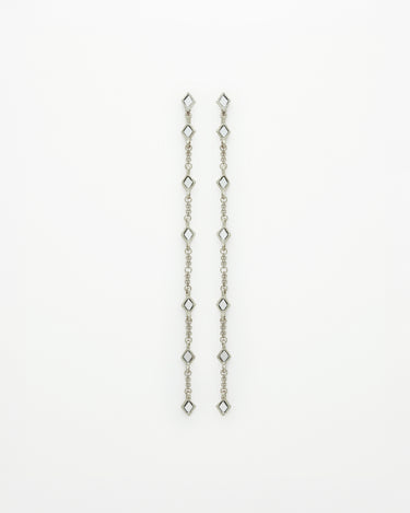 Pendientes extralargos elaborados en latón con baño de plata. Cada pieza combina una delicada cadena plateada con espejos engarzados a mano en forma de rombo. Su diseño estiliza y crea un efecto luminoso con cada movimiento. Ligeros, elegantes y muy favorecedores.