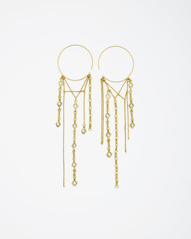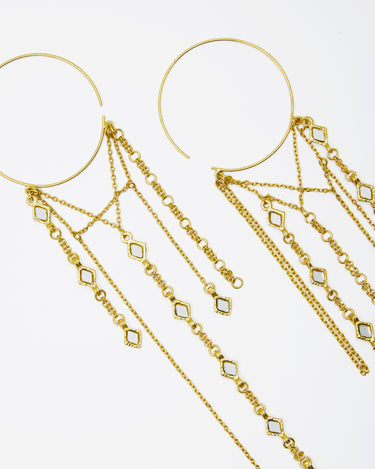 Pendientes grandes de aro elaborados en latón con baño de oro. Cuelgan varias cadenas finas y pequeños espejos engarzados a mano, que capturan la luz con cada movimiento. Son ligeros, llamativos y muy cómodos de llevar. Son sutiles pero con carácter.