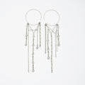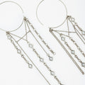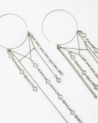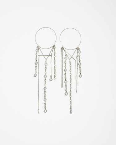 Pendientes grandes de aro elaborados en latón con baño de plata. Cuelgan varias cadenas finas y pequeños espejos engarzados a mano, que capturan la luz con cada movimiento. Son ligeros, llamativos y muy cómodos de llevar. Son sutiles pero con carácter.