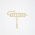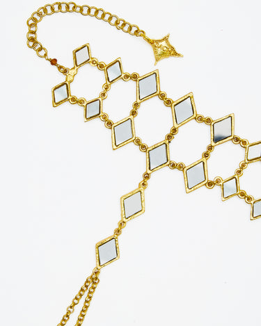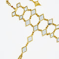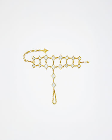 Pulsera elaborada en latón con baño de oro, formada por rombos con espejos engarzados a mano. Se sujeta en la muñeca con cierre ajustable y cuenta con una extensión que conecta con un anillo.