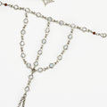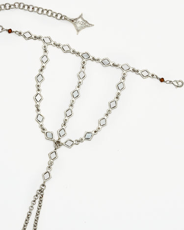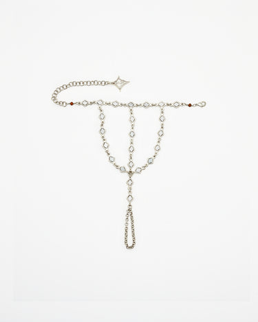 Pulsera elaborada en latón con baño de plata, compuesta por múltiples cadenas decoradas con espejos en forma de rombo engarzados a mano. Se ajusta a la muñeca con cierre y se prolonga hacia el dedo mediante un anillo de cadena.