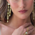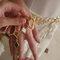Pulsera elaborada en latón con baño de oro, formada por rombos con espejos engarzados a mano. Se sujeta en la muñeca con cierre ajustable y cuenta con una extensión que conecta con un anillo.