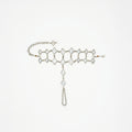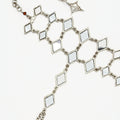 Pulsera elaborada en latón con baño de plata, formada por rombos con espejos engarzados a mano. Se sujeta en la muñeca con cierre ajustable y cuenta con una extensión que conecta con un anillo.