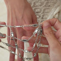 Pulsera en latón con baño de plata, formada por múltiples cadenas decoradas con espejos rectangulares engarzados a mano. La pieza se ajusta a la muñeca y conecta con un anillo sencillo que rodea el dedo. Las cadenas caen de forma asimétrica generando un efecto de red dorada que adorna toda la mano.