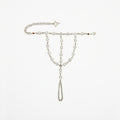 Pulsera elaborada en latón con baño de plata, compuesta por múltiples cadenas decoradas con espejos en forma de rombo engarzados a mano. Se ajusta a la muñeca con cierre y se prolonga hacia el dedo mediante un anillo de cadena.