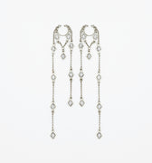 Earcuff de latón con baño de plata, compuesto por una cadena que cae en tres diferentes longitudes. Cada cadena presenta una secuencia de pequeños espejos en forma de rombo, engarzados a mano. La estructura superior se ajusta a la oreja sin necesidad de agujero. Diseñada para lucirse sola o acompañar a otros pendientes.