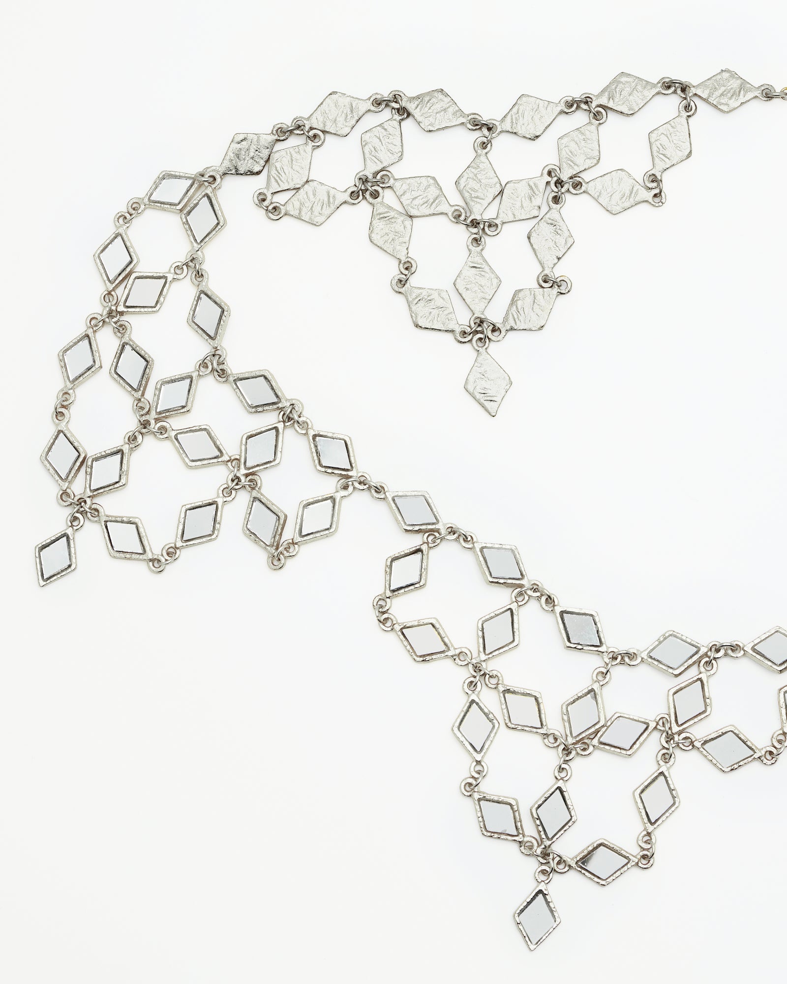 Cinturón articulado elaborado en latón con baño de plata, con pequeños espejos engarzados a mano en forma de rombos que dibujan olas. Es nuestro best seller reinventado, aún más impactante.