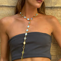 Collar tipo Y necklace elaborado en latón con baño de oro y pequeños espejos engarzados a mano en forma de rombos. Refleja la luz con cada movimiento, alargando visualmente la silueta. Una pieza sofisticada y femenina.