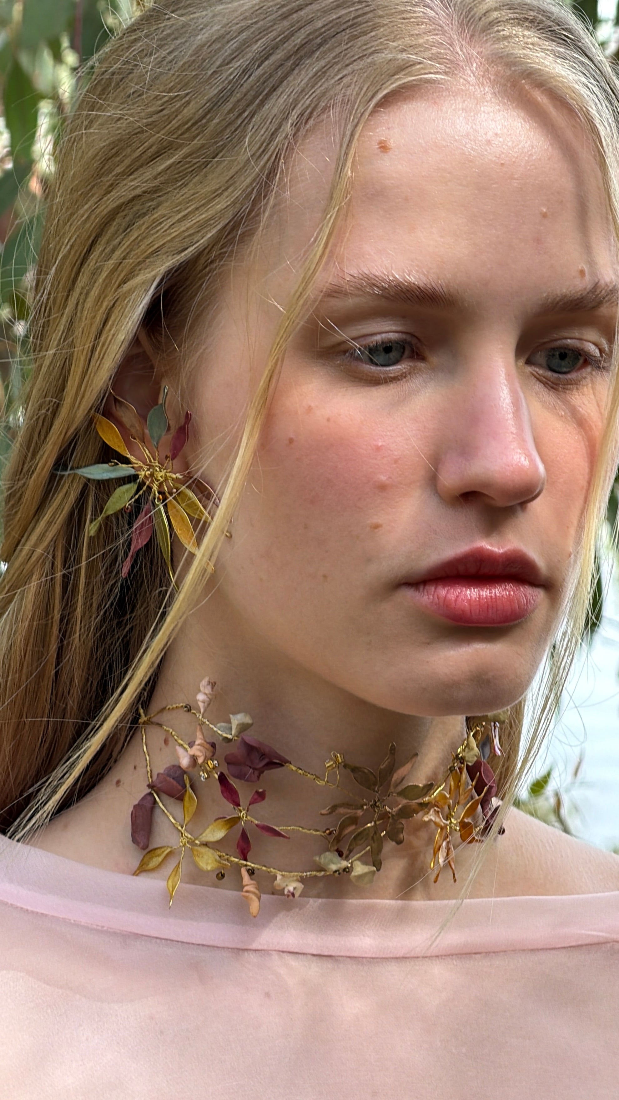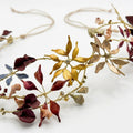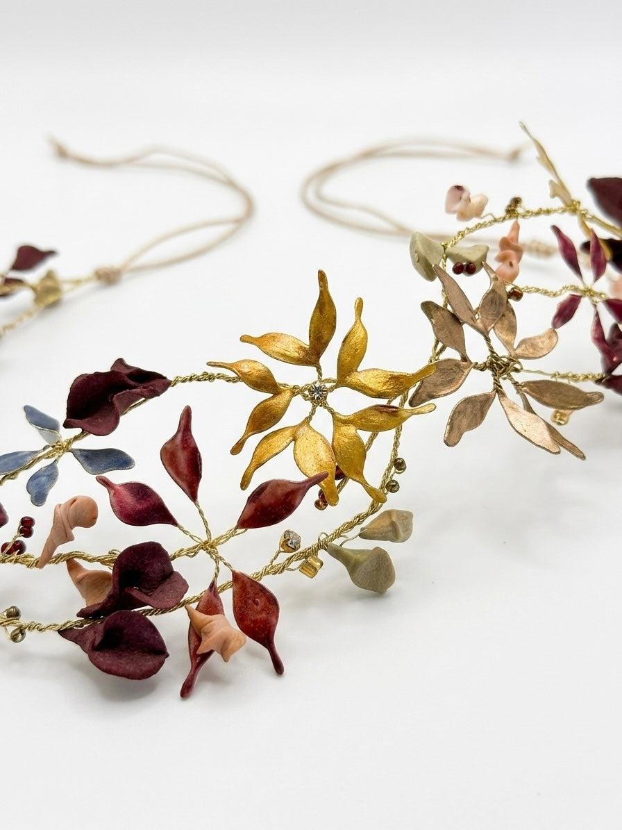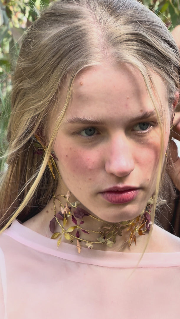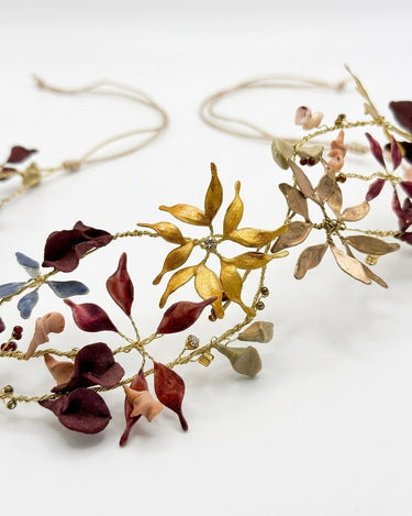 Materiales: Hilo de alpaca en latón y cobre con baño de plata. Capas infinitas creadas a través de un minucioso proceso de superposición de barnices y tintes que aportan profundidad y color. Cierre de hilo compuesto por un 67% de algodón y un 33% de rayón. Detalles con piezas de cristal checo, strass y abalorios cuidadosamente seleccionados.