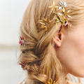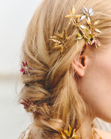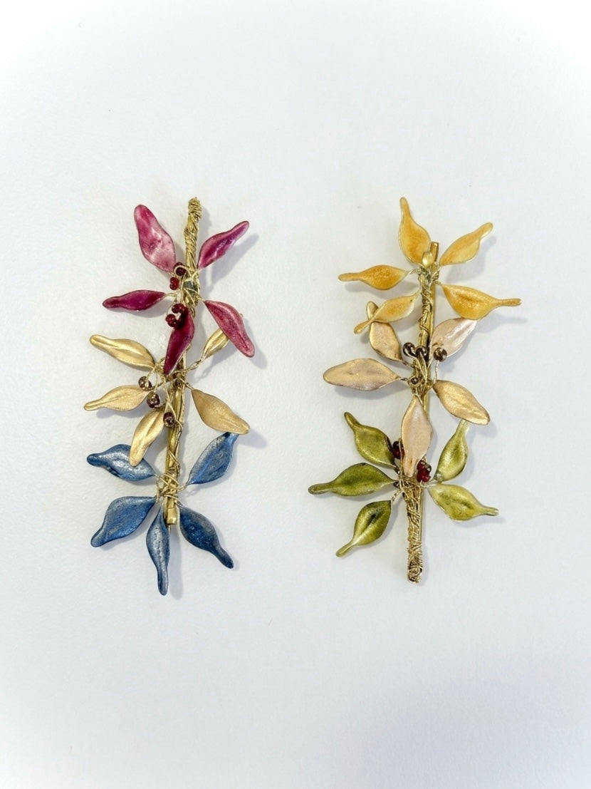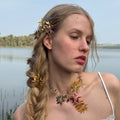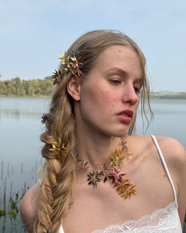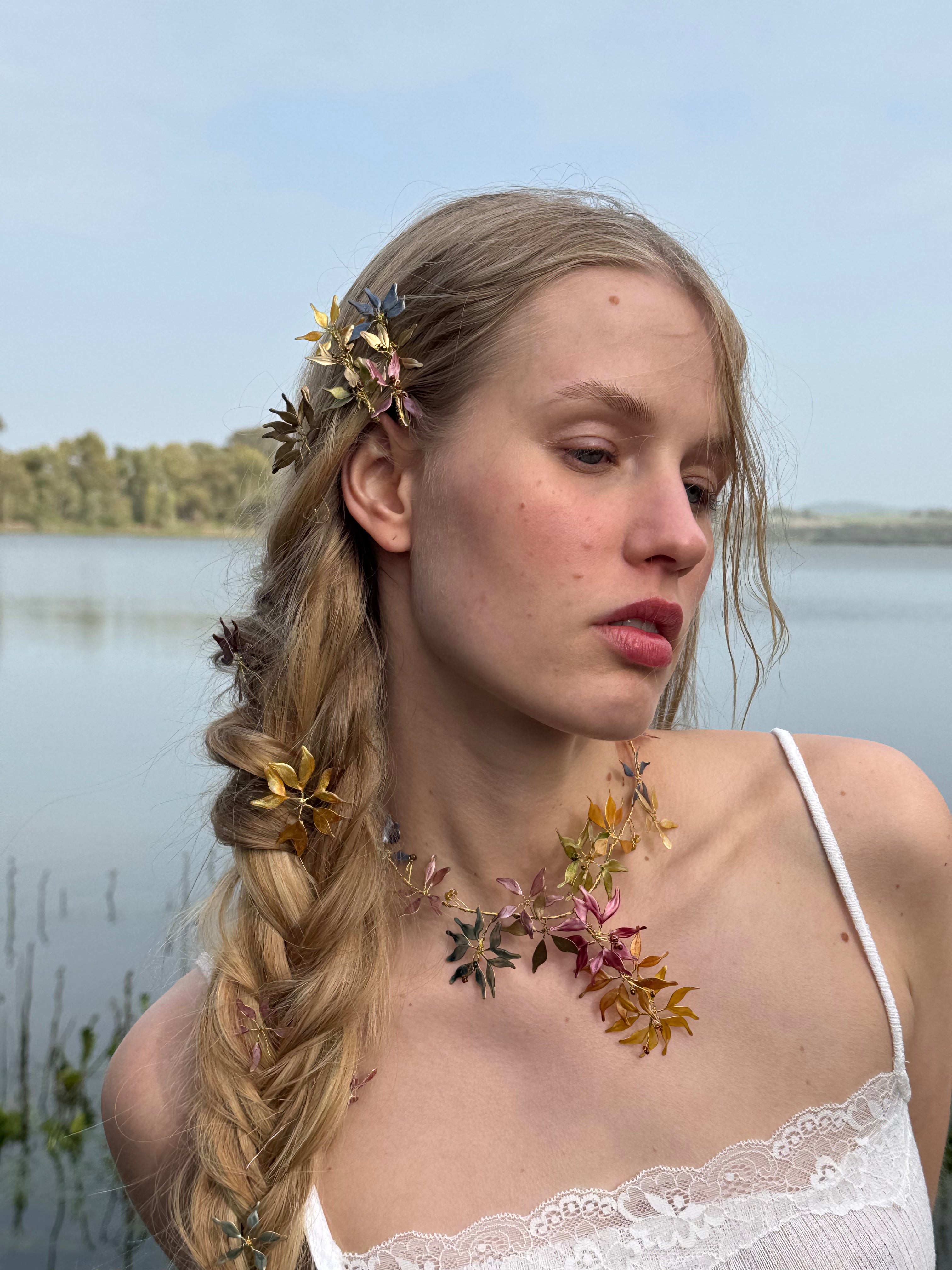 Materiales: Hilo de alpaca en latón y cobre con baño de oro. Capas infinitas creadas a través de un minucioso proceso de superposición de barnices y tintes que aportan profundidad y color. Detalles con piezas de cristal checo, strass y abalorios cuidadosamente seleccionados.