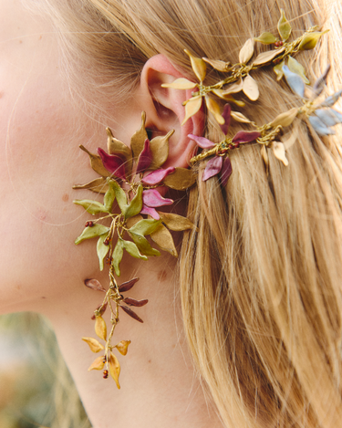 Materiales: Hilo de alpaca en latón y cobre con baño de oro. Capas infinitas creadas a través de un minucioso proceso de superposición de barnices y tintes que aportan profundidad y color. Detalles con piezas de cristal checo, strass y abalorios cuidadosamente seleccionados.