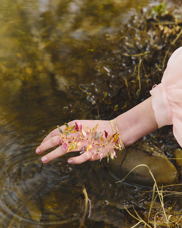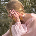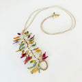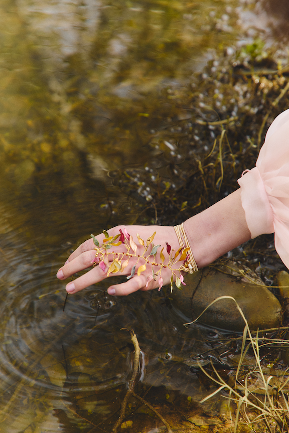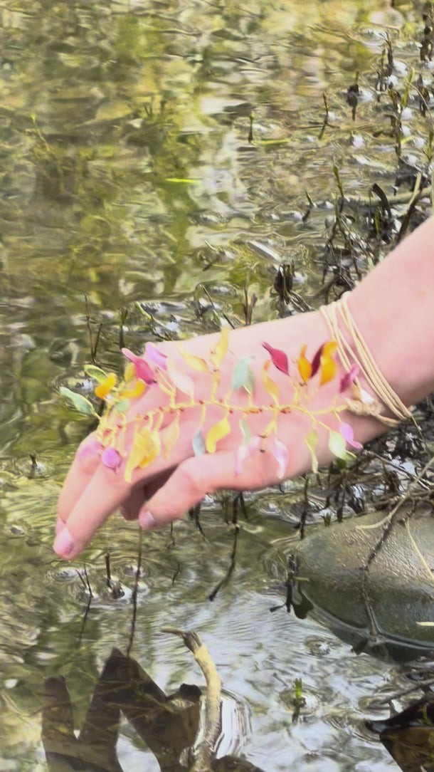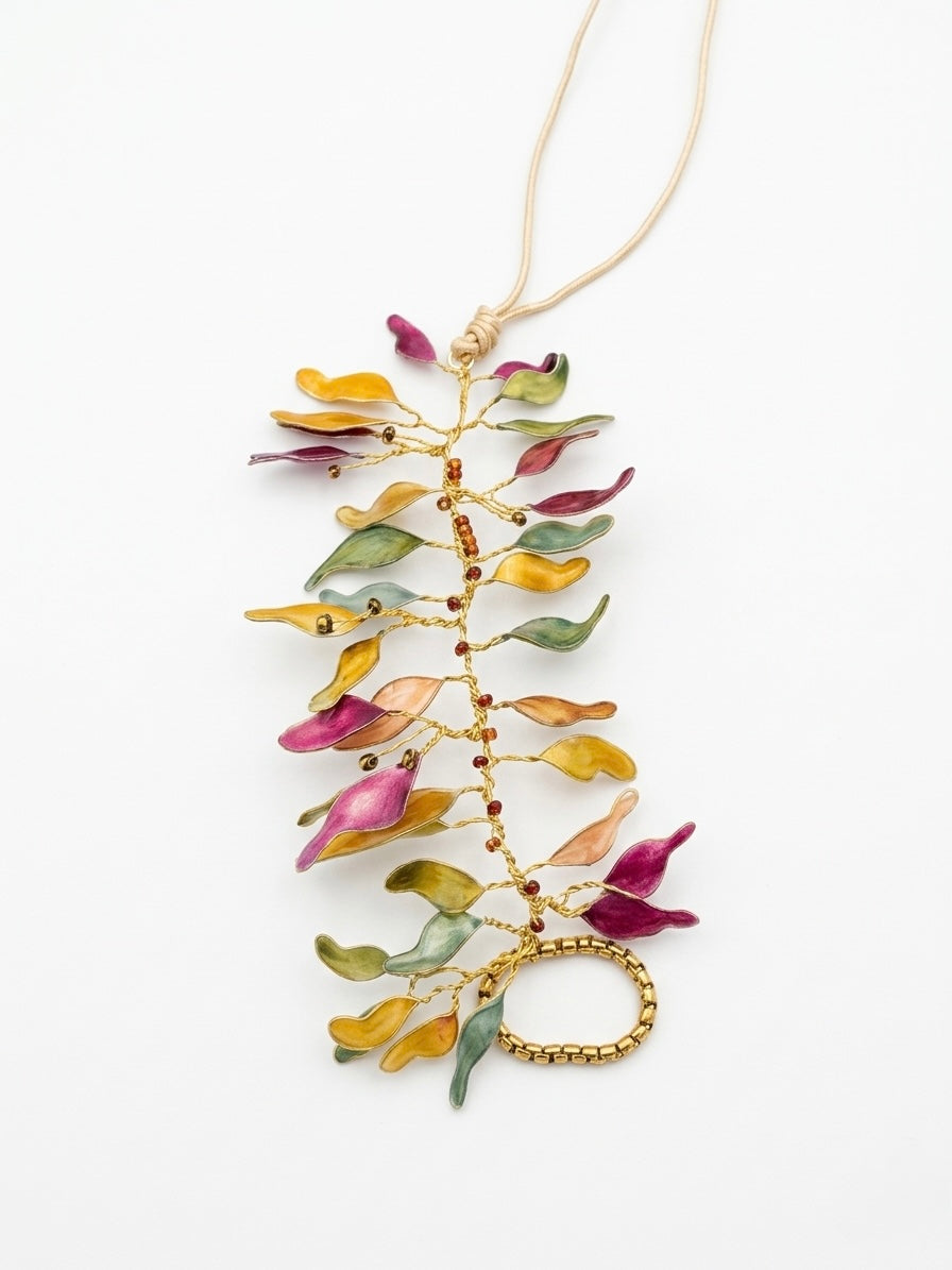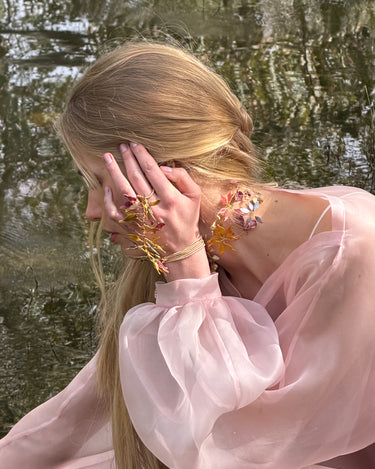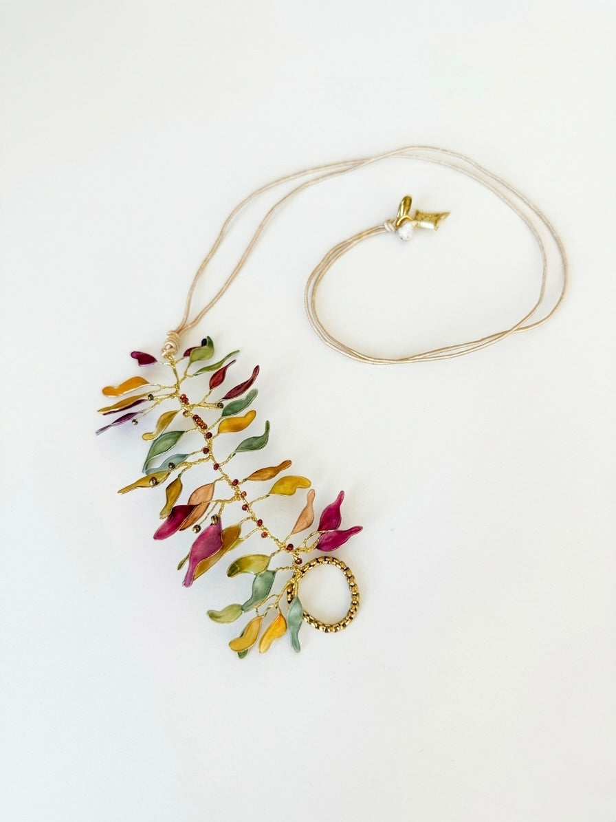 Materiales: Hilo de alpaca en latón y cobre con baño de oro. Capas infinitas creadas a través de un minucioso proceso de superposición de barnices y tintes que aportan profundidad y color. Detalles con piezas de cristal checo, strass y abalorios cuidadosamente seleccionados.