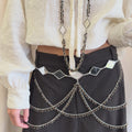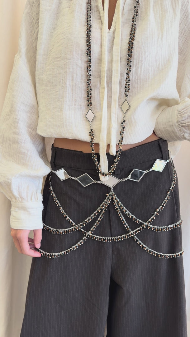 Transformable belt crafted from a silver chain with diamond-shaped mirrors and delicate interwoven chains adorned with brown and black beads. Its multi-position design allows it to be worn as a belt , necklace , cape , or shoulder bag , adapting to the body with a fluid yet structured movement.
