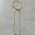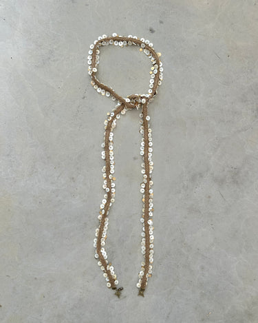 Transformable necklace-belt crafted from a gold chain intertwined with natural mother-of-pearl discs, which fall with a fluid movement. Its multi-position design allows it to be worn as a choker with long pendants, wrapped several times around the neck, or as a delicate belt that hugs the waist.