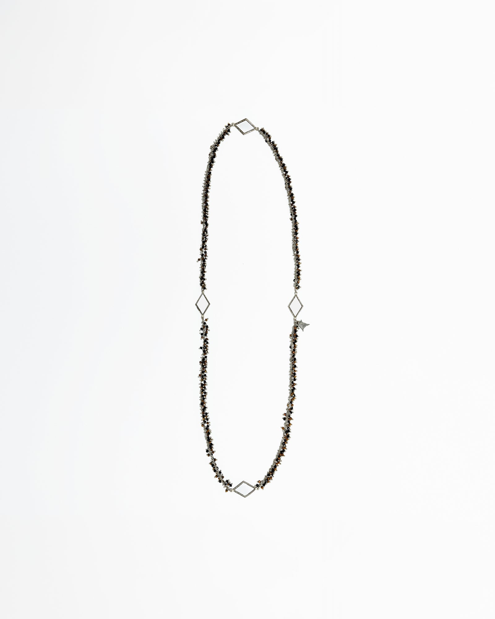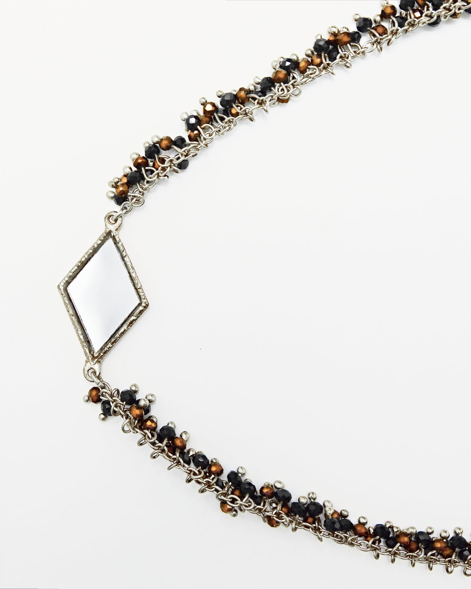 This long, transformable necklace features a silver chain interwoven with black and brown metallic beads and mirrored diamonds that catch the light. Its design allows it to be worn as a single long loop or doubled , creating a choker effect with a front-facing drape.