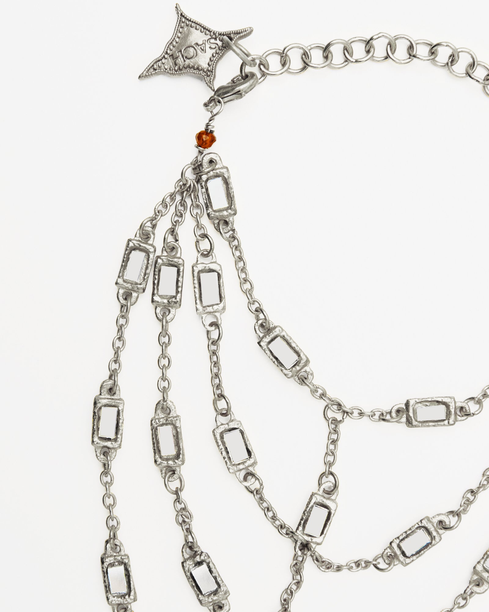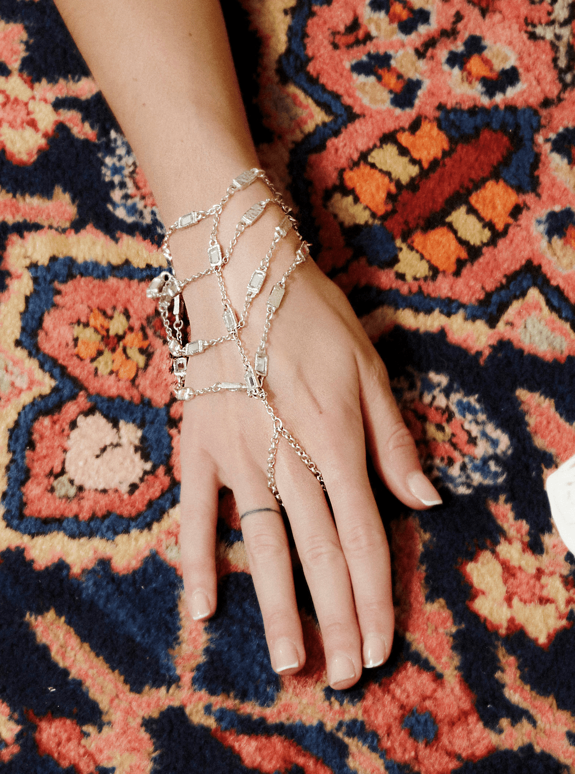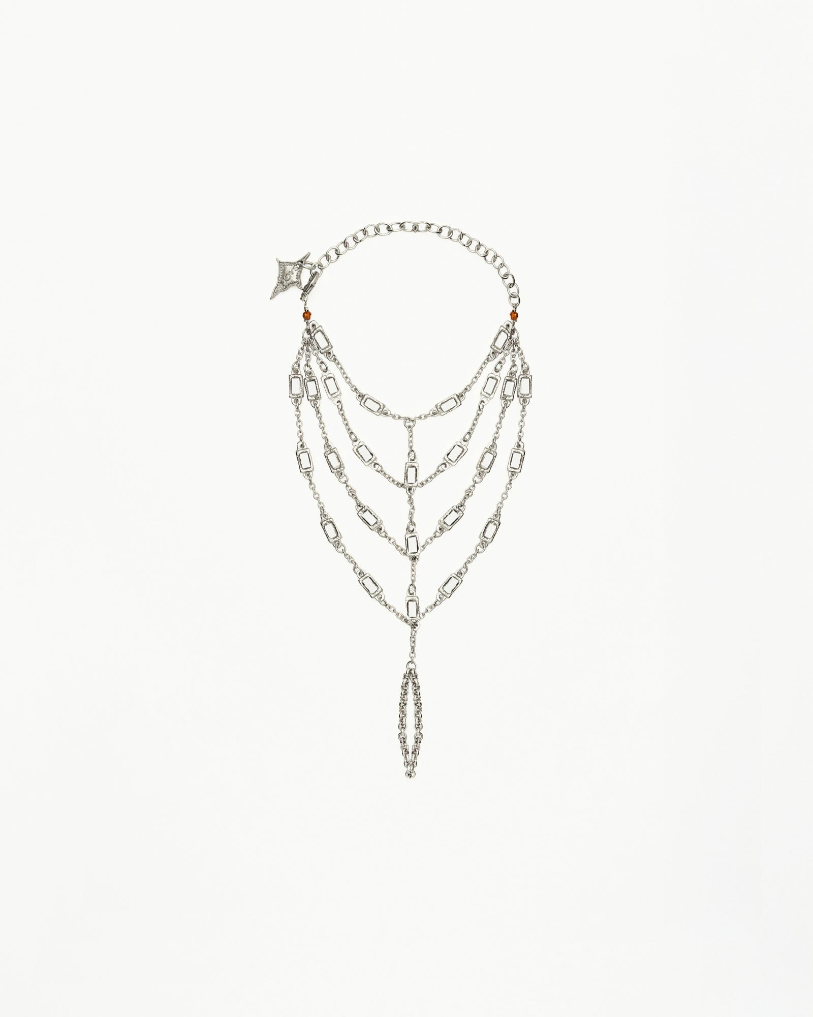 Silver-plated brass bracelet made of multiple chains decorated with hand-set rectangular mirrors. The piece fits snugly around the wrist and connects to a simple ring that encircles the finger. The chains fall asymmetrically, creating a golden net effect that adorns the entire hand.