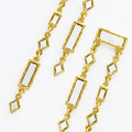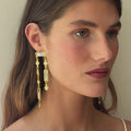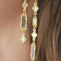 Gold-plated vertical structure earrings, crafted from gold-plated brass. They feature a combination of rectangular and diamond-shaped pieces with hand-set mirrors. Their design adds light and movement, creating a unique piece that elevates any look.