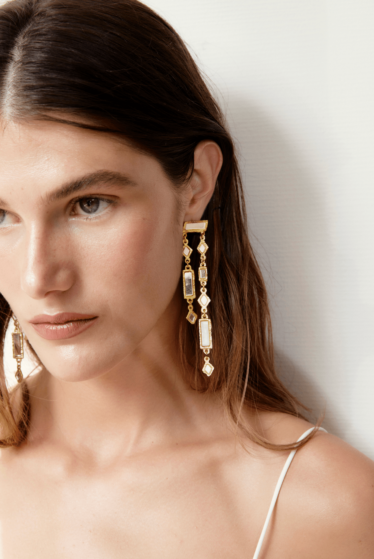 Gold earrings with rectangular pendants and mirrors