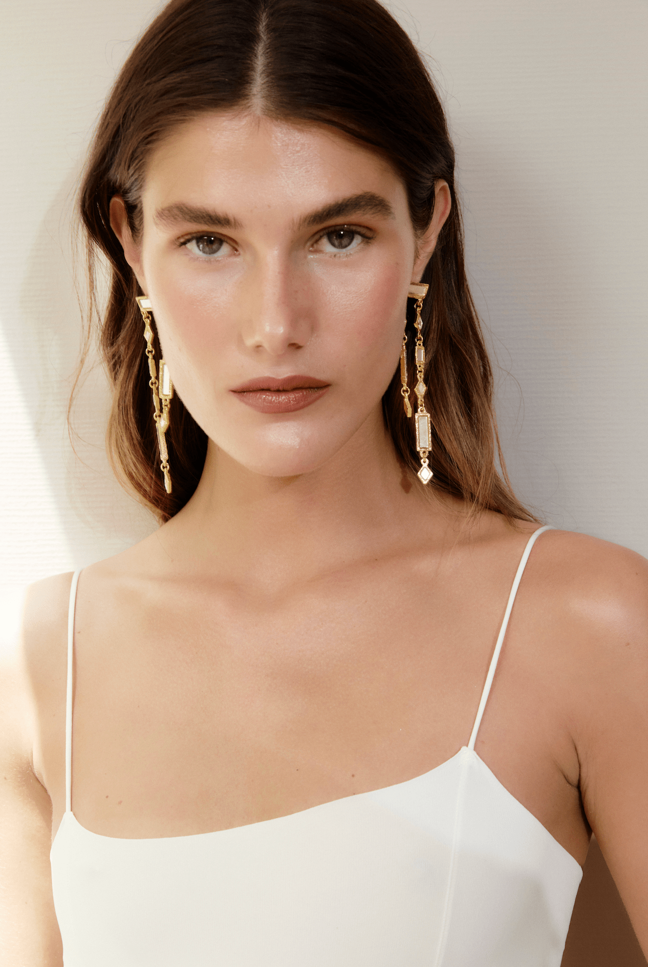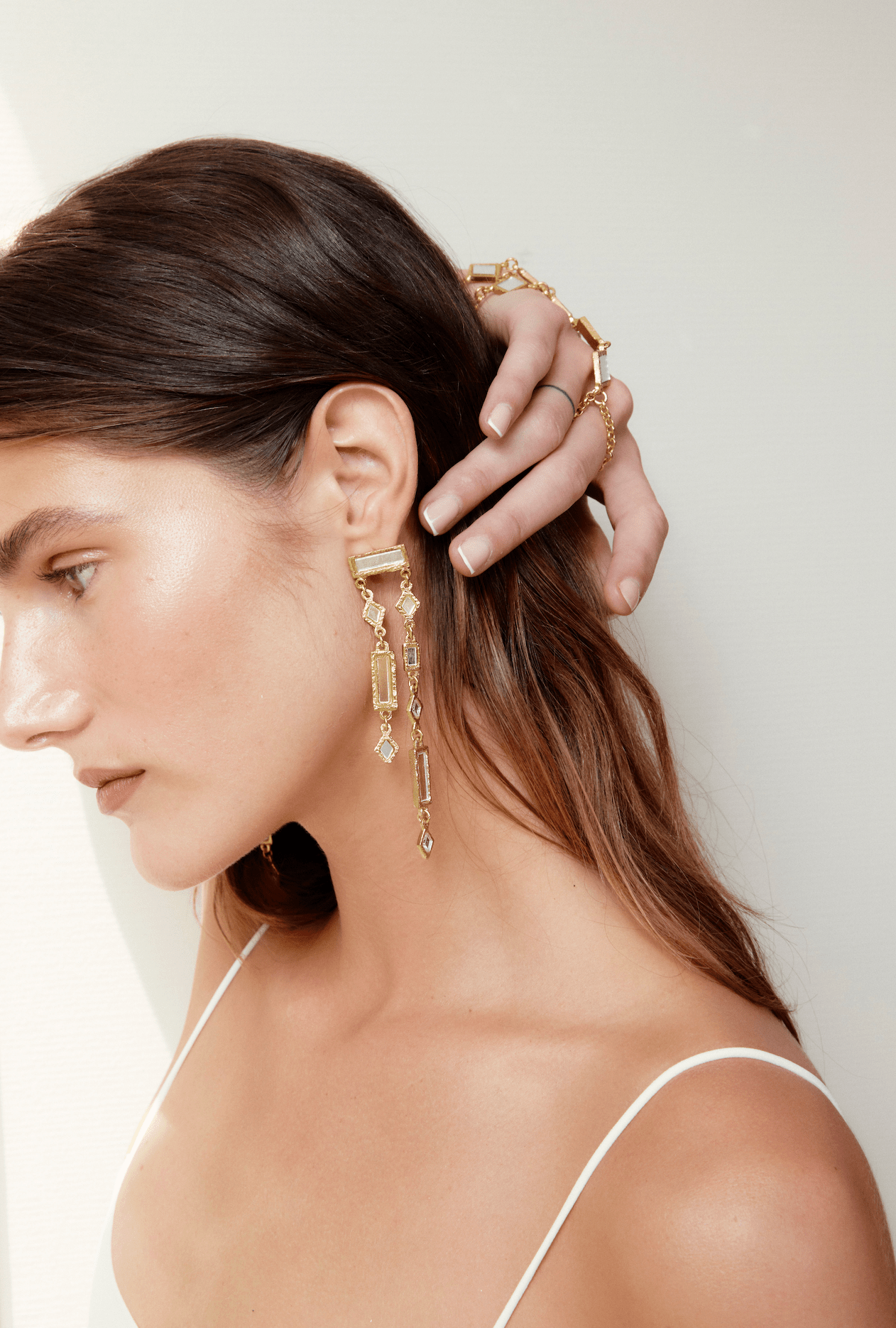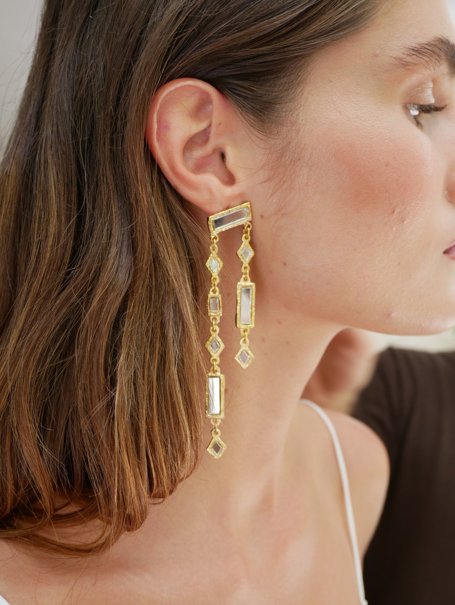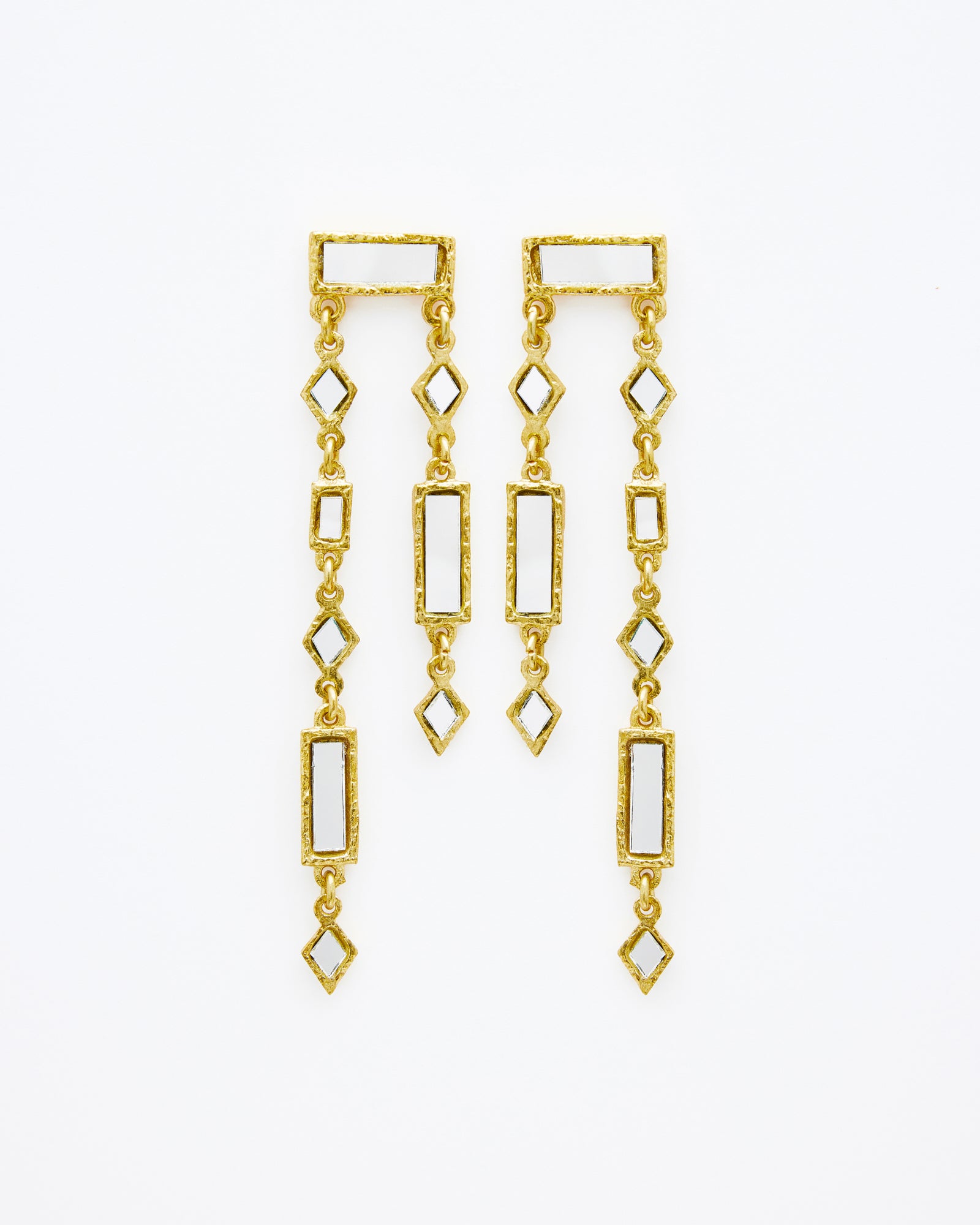 Gold-plated vertical structure earrings, crafted from gold-plated brass. They feature a combination of rectangular and diamond-shaped pieces with hand-set mirrors. Their design adds light and movement, creating a unique piece that elevates any look.