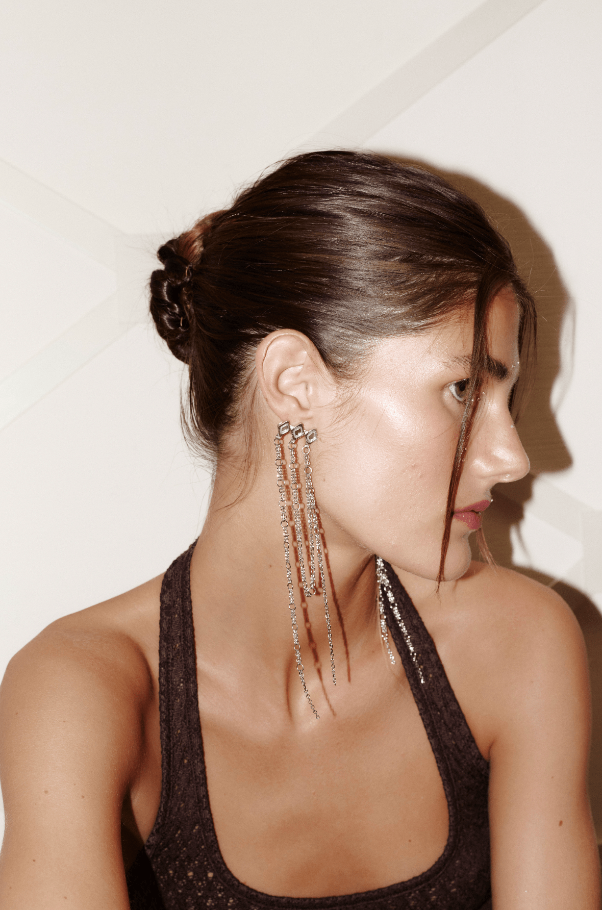 A pendant featuring three hand-set mirror diamonds and three fine chains that dangle with movement. They're the perfect accessory to transform any look.