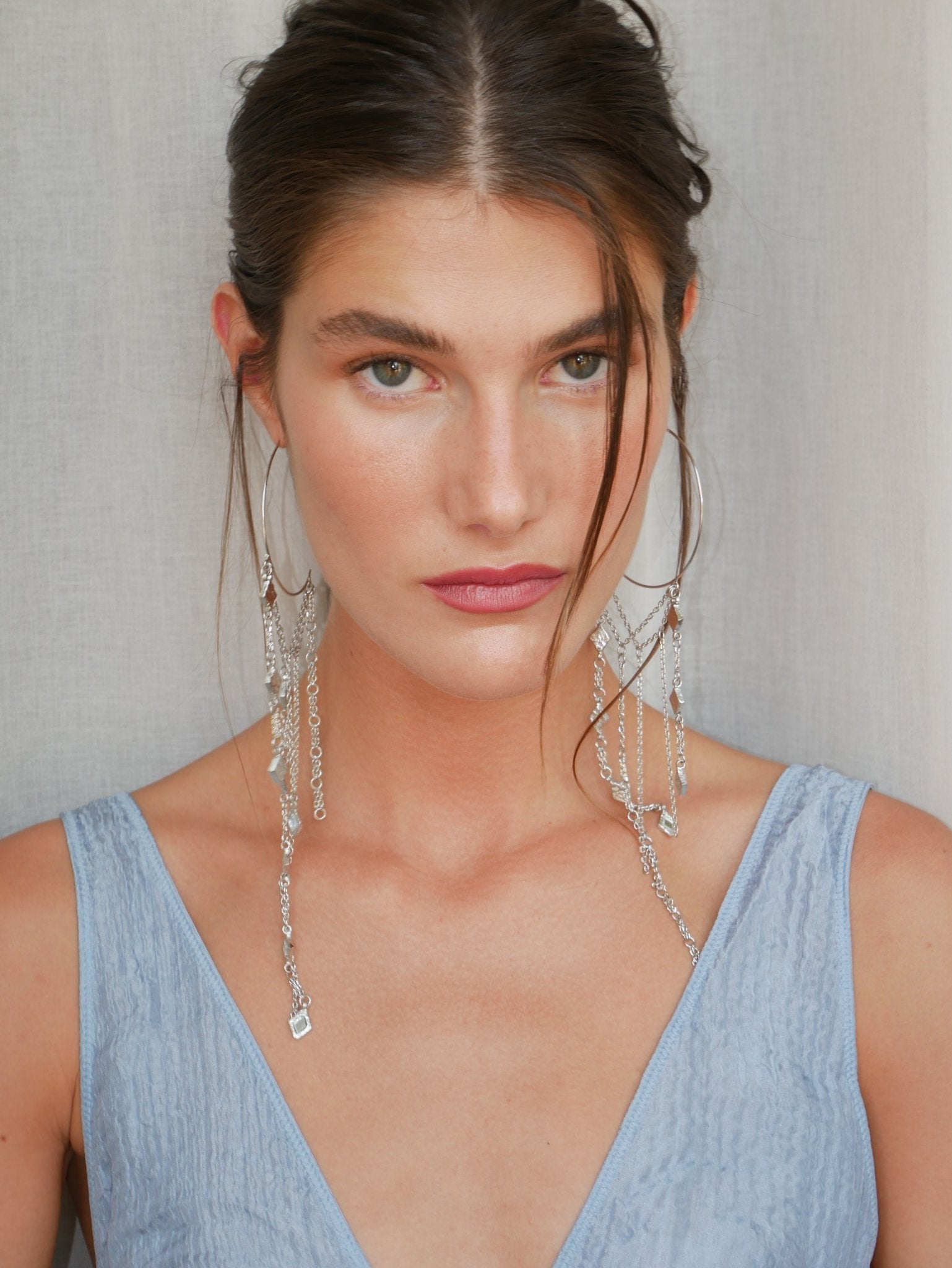 Large hoop earrings crafted from silver-plated brass. They feature several fine chains and small, hand-set mirrors that capture the light with every movement. They're lightweight, eye-catching, and very comfortable to wear. Subtle yet distinctive.