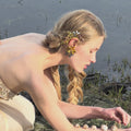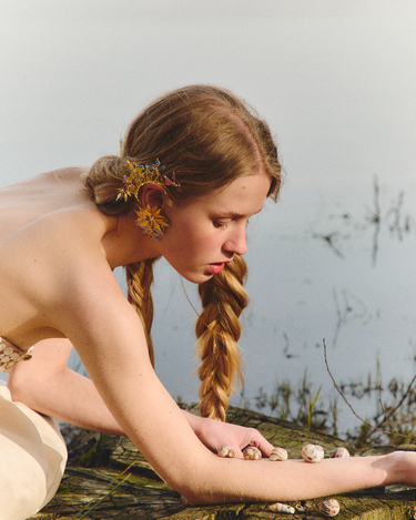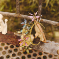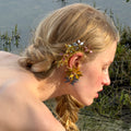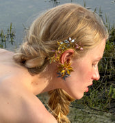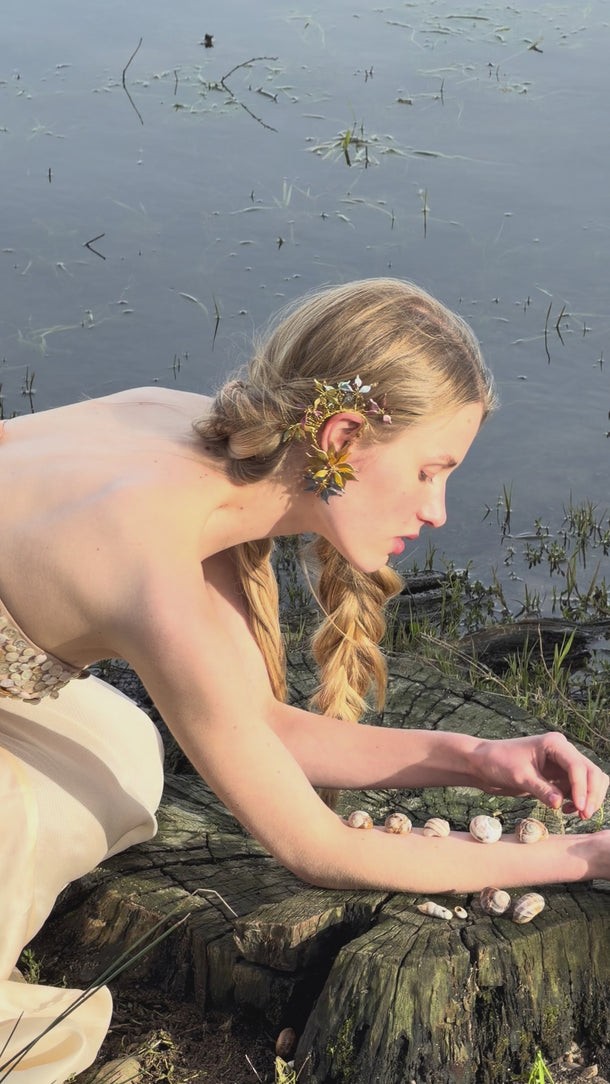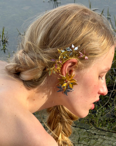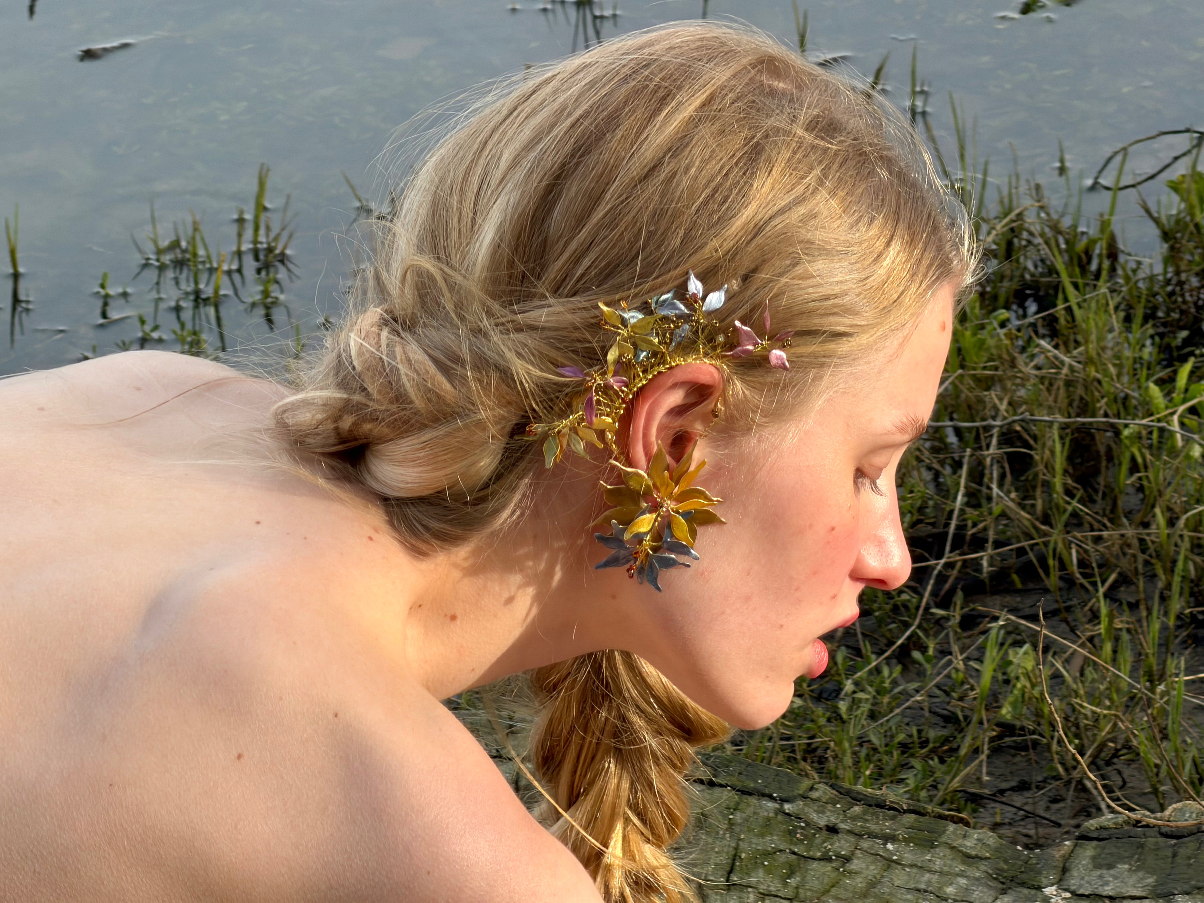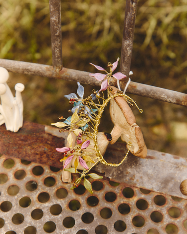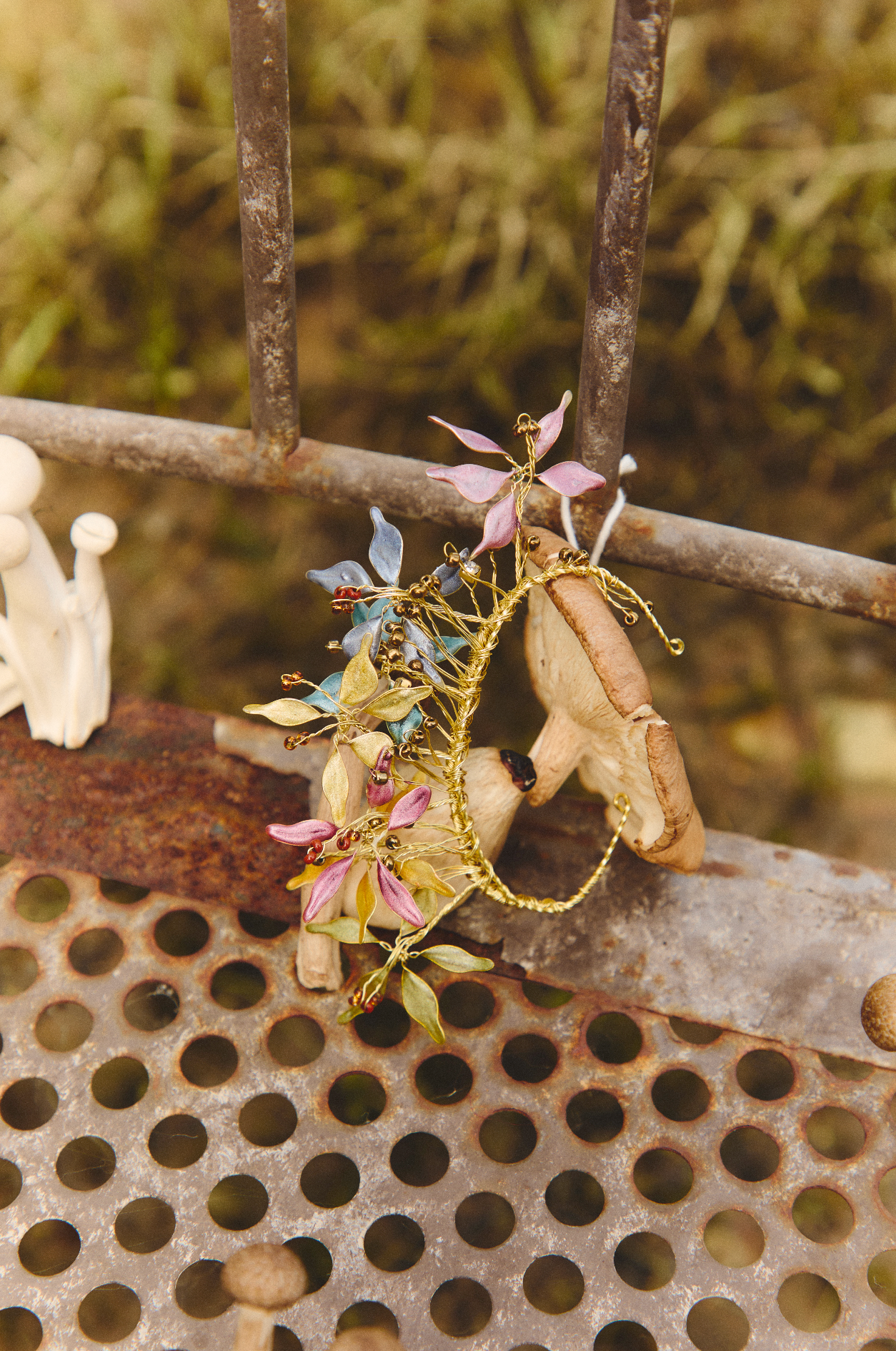 Materiales: Hilo de alpaca en latón y cobre con baño de oro. Capas infinitas creadas a través de un minucioso proceso de superposición de barnices y tintes que aportan profundidad y color.  Detalles con piezas de cristal checo, strass y abalorios cuidadosamente seleccionados.