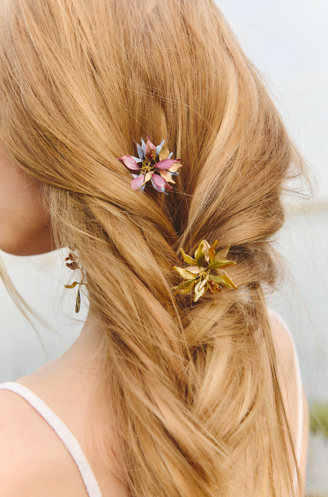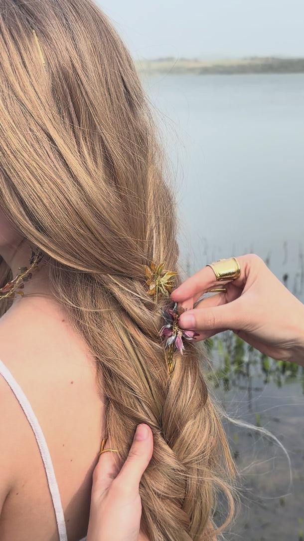 Materiales: Hilo de alpaca en latón y cobre con baño de oro. Capas infinitas creadas a través de un minucioso proceso de superposición de barnices y tintes que aportan profundidad y color. Detalles con piezas de cristal checo, strass y abalorios cuidadosamente seleccionados.