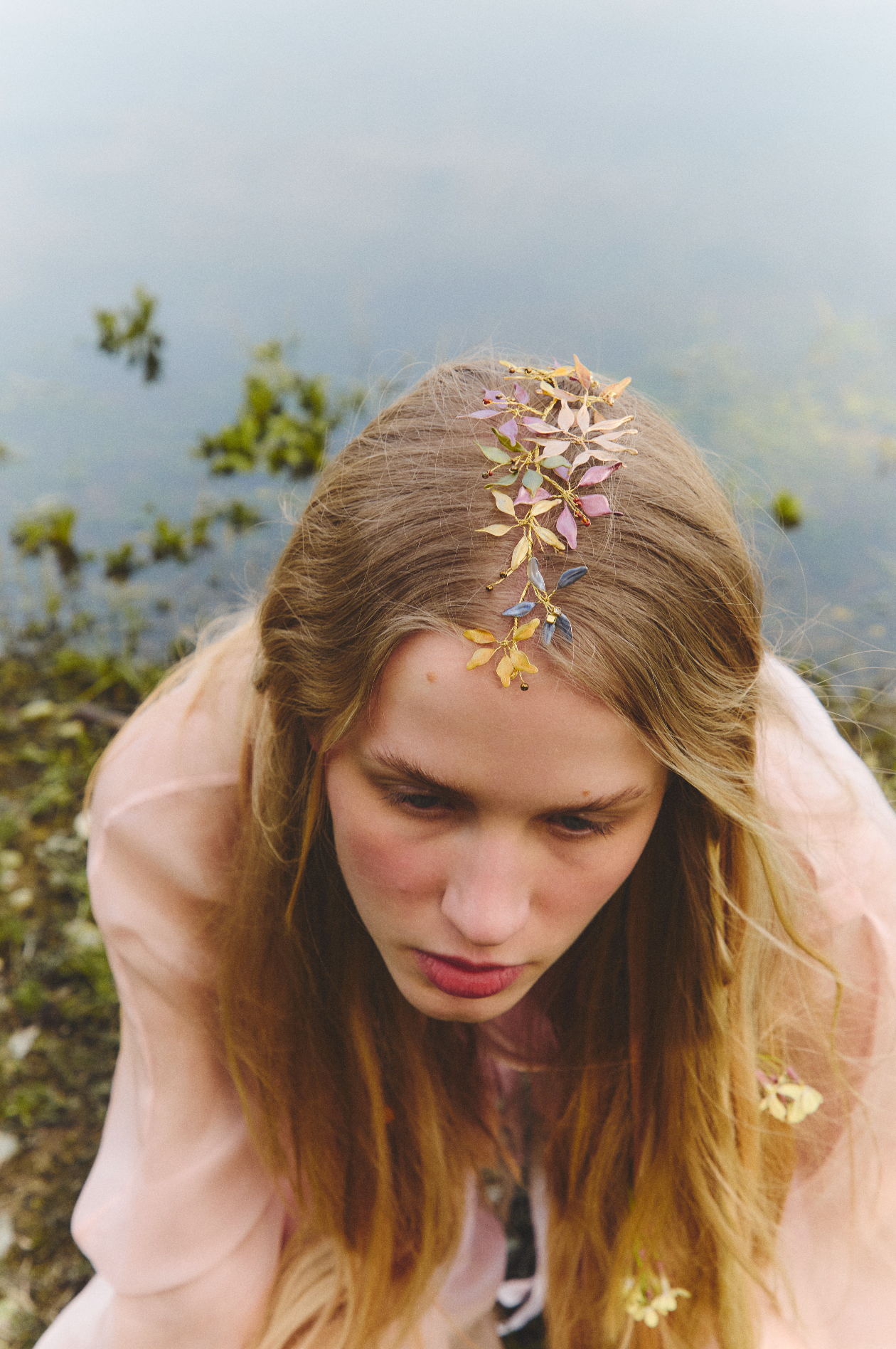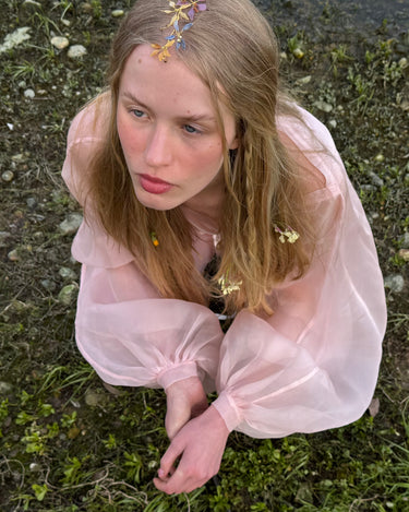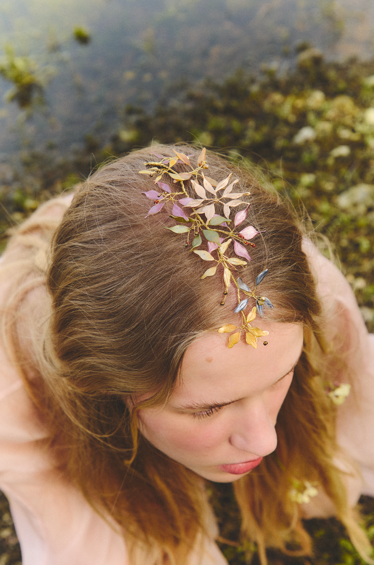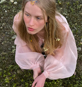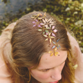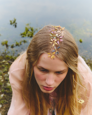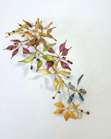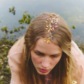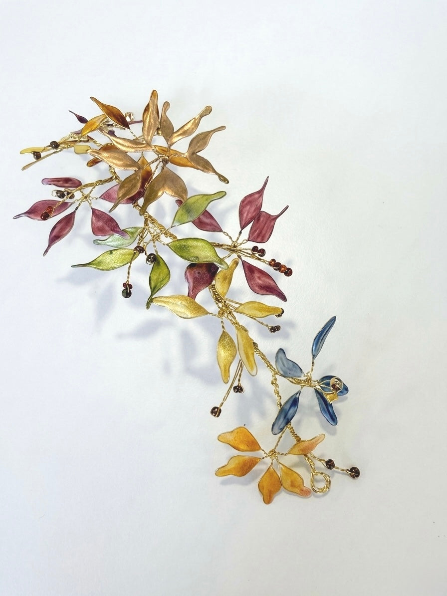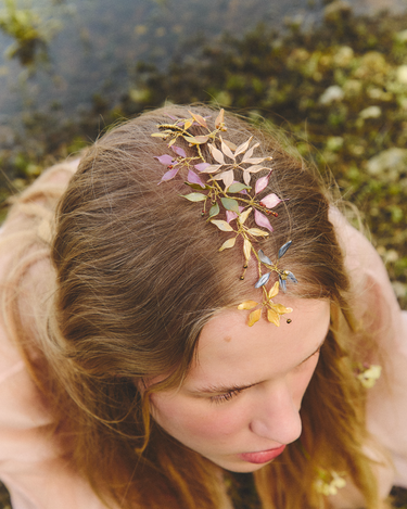 Materiales: Hilo de alpaca en latón y cobre con baño de plata. Capas infinitas creadas a través de un minucioso proceso de superposición de barnices y tintes que aportan profundidad y color. Cierre de hilo compuesto por un 67% de algodón y un 33% de rayón. Detalles con piezas de cristal checo, strass y abalorios cuidadosamente seleccionados.
