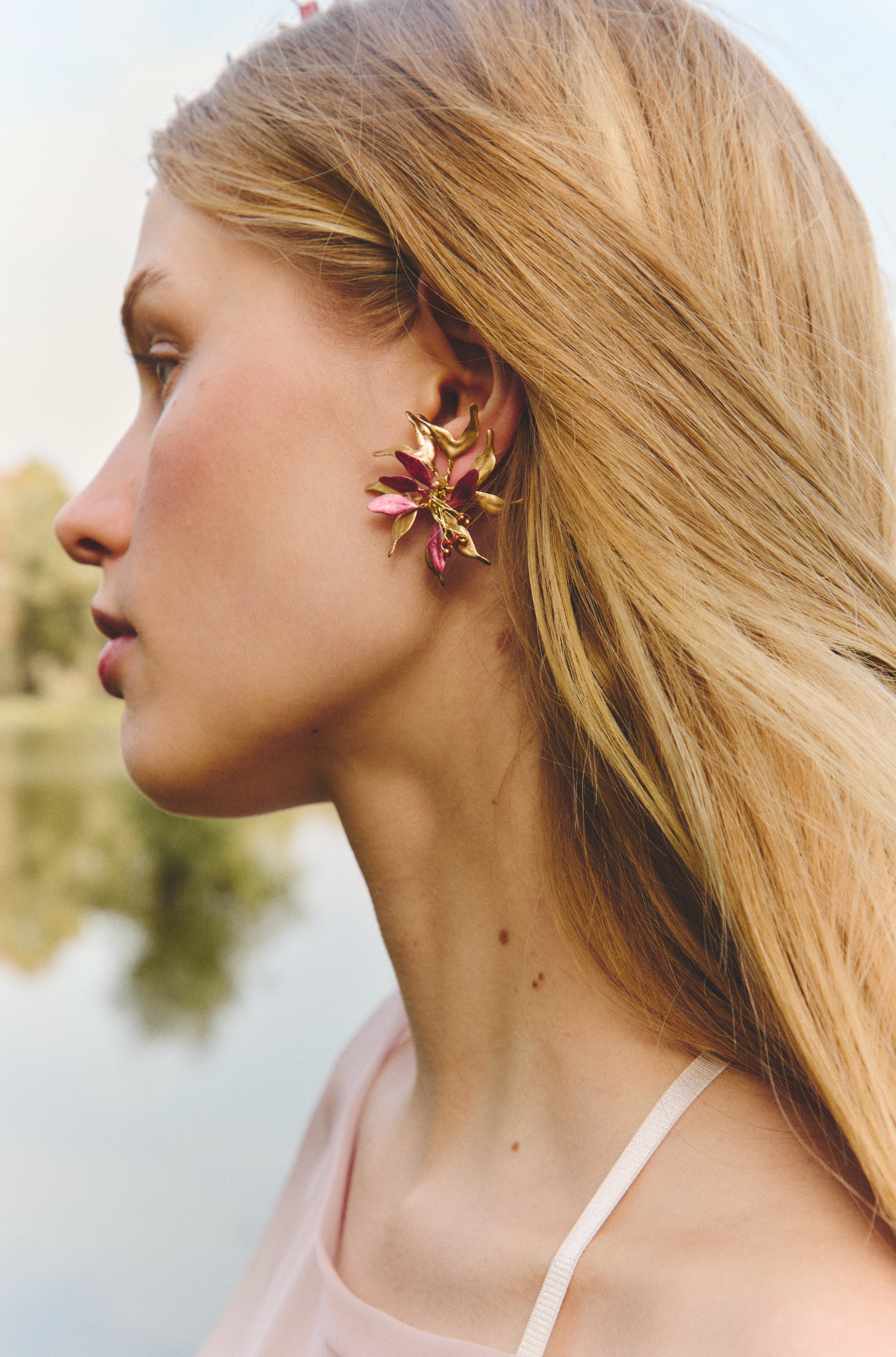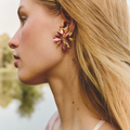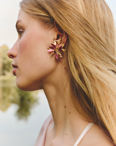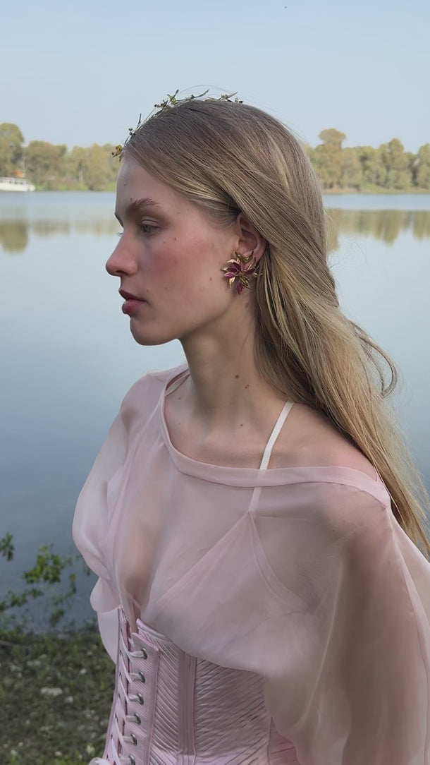 Materiales: Hilo de alpaca en latón y cobre con baño de oro. Capas infinitas creadas a través de un minucioso proceso de superposición de barnices y tintes que aportan profundidad y color. Detalles con piezas de cristal checo, strass y abalorios cuidadosamente seleccionados.